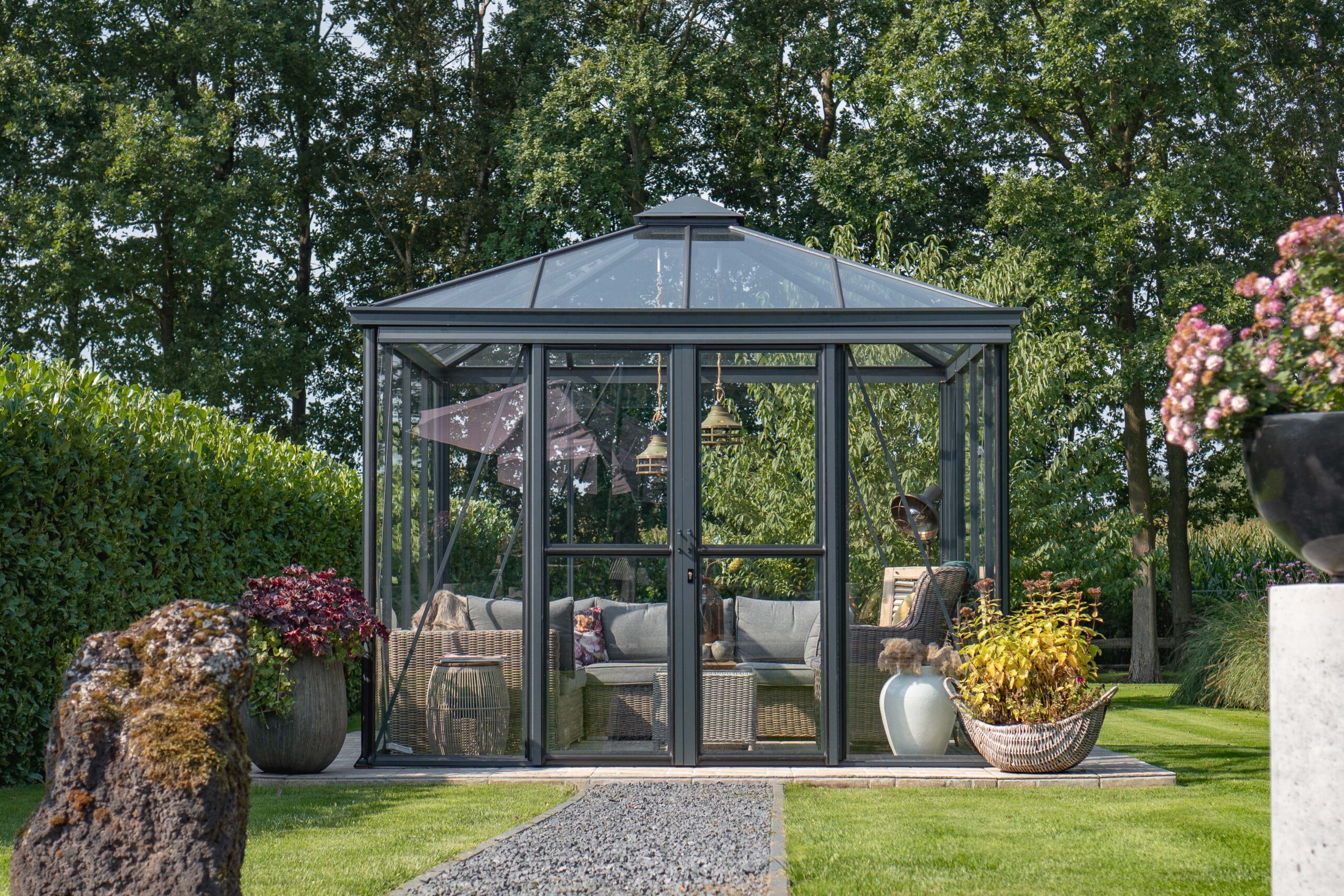 De Pyra onderscheidt zich door zijn kenmerkende piramidevormige dak, wat zorgt voor een ruimtelijk effect en een optimale lichtinval. Deze elegante oranjerie biedt niet alleen een gunstig groeiklimaat voor uw planten, maar ook een sfeervolle plek om te ontspannen. De hoogwaardige materialen en duurzame constructie maken dit model zowel functioneel als een stijlvolle eyecatcher in uw tuin.